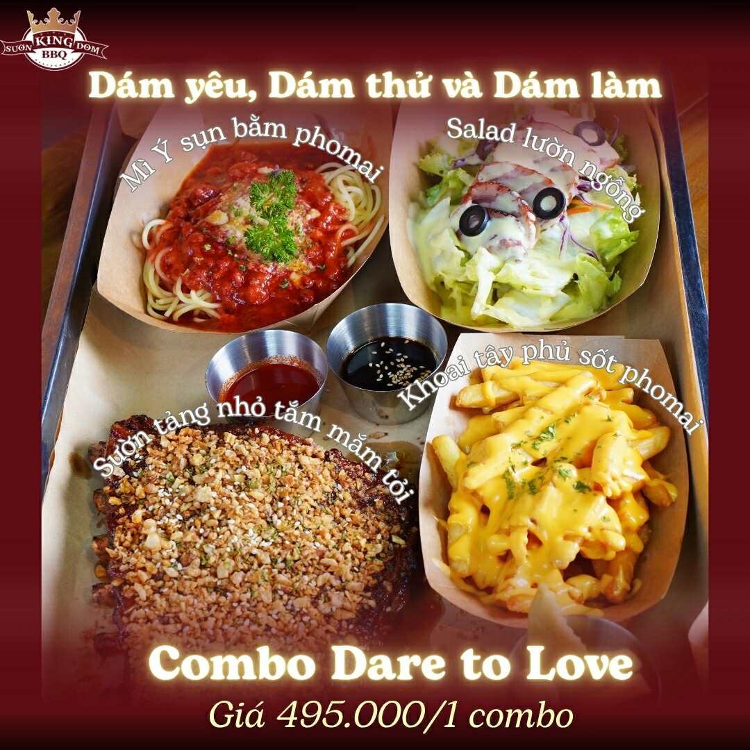 Khác với một Mini Love đầy đơn giản và trọn vị thì Dare To Love lại mang tinh thần “dám yêu – dám thử” của thương hiệu. Vẫn là tảng Sườn Mắm Tỏi must try, kết hợp cùng Mì Ý sụn bằm phủ phomai Parmesan thơm nức, Khoai tây chiên phủ phô mai béo ngậy, và Salad lườn ngỗng xông khói đậm vị.