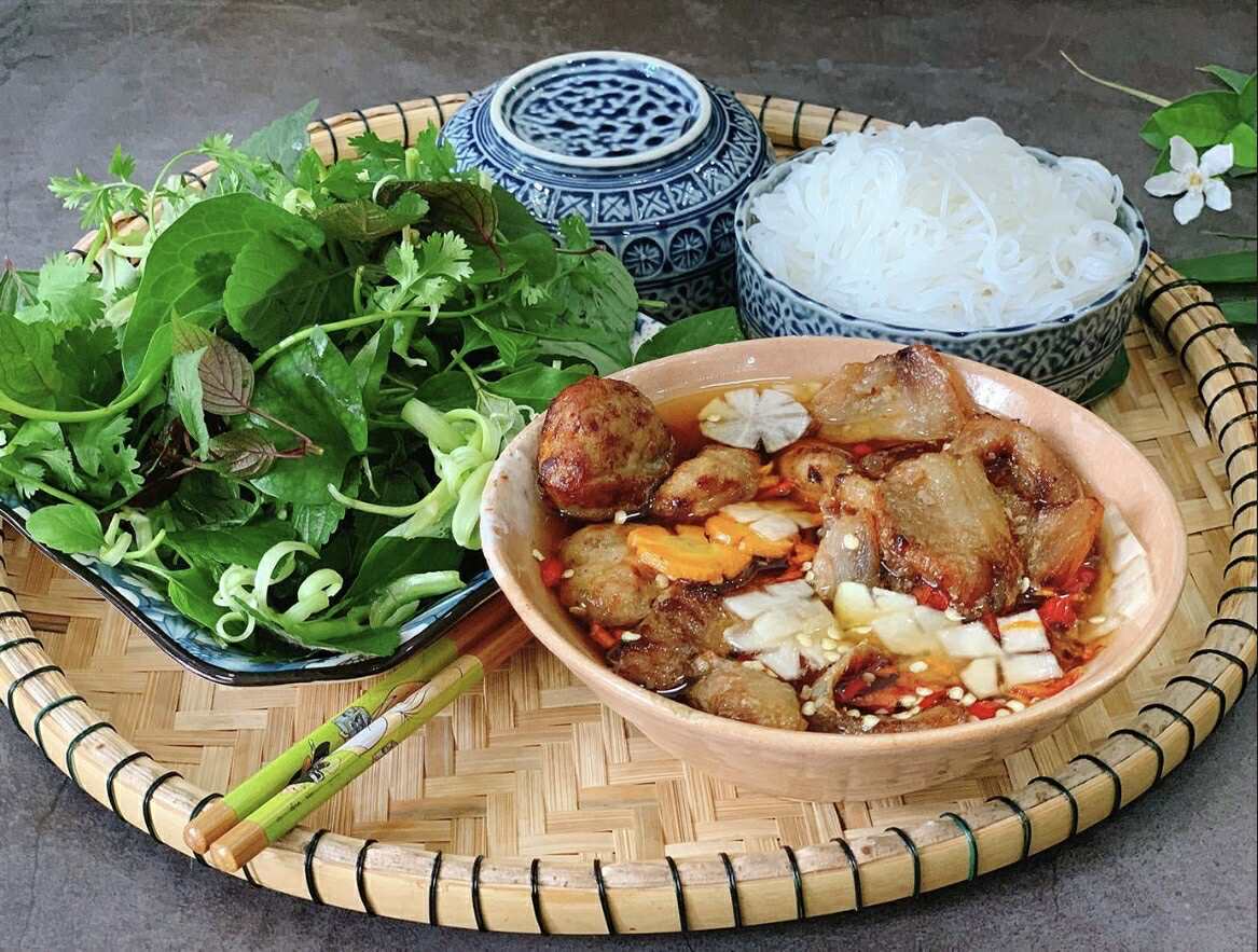 Thịt ba chỉ và thịt viên được nướng trên than hoa, tỏa hương thơm lừng, sau đó thả vào bát nước mắm pha đậm đà với đu đủ xanh thái lát. Khi ăn, bún tươi và rau sống được chan cùng, tạo nên sự cân bằng hoàn hảo giữa vị béo ngậy và thanh mát. Đây cũng chính là món từng được Tổng thống Mỹ Obama lựa chọn khi ghé Hà Nội.