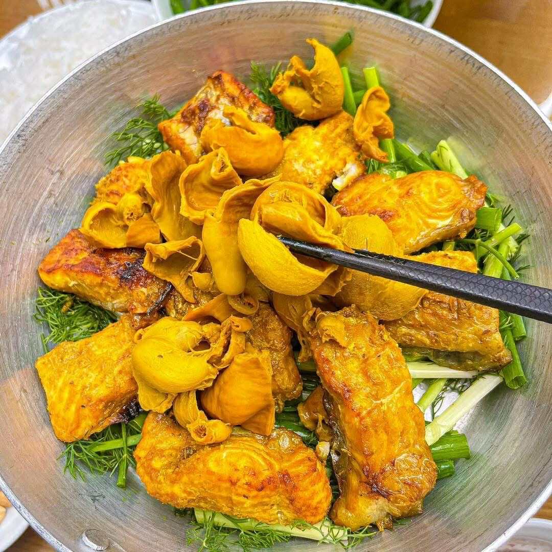 Món ăn nổi tiếng từ thời Pháp thuộc này được chế biến từ cá lăng tươi, cắt miếng vuông vừa ăn, ướp với nghệ, riềng và gia vị đặc trưng. Khi ăn, cá được xào nóng trên chảo mỡ với thì là, hành lá, ăn kèm bún rối, lạc rang và mắm tôm. Hương thơm béo ngậy và vị ngọt tự nhiên của cá chắc chắn sẽ khiến bạn khó quên.